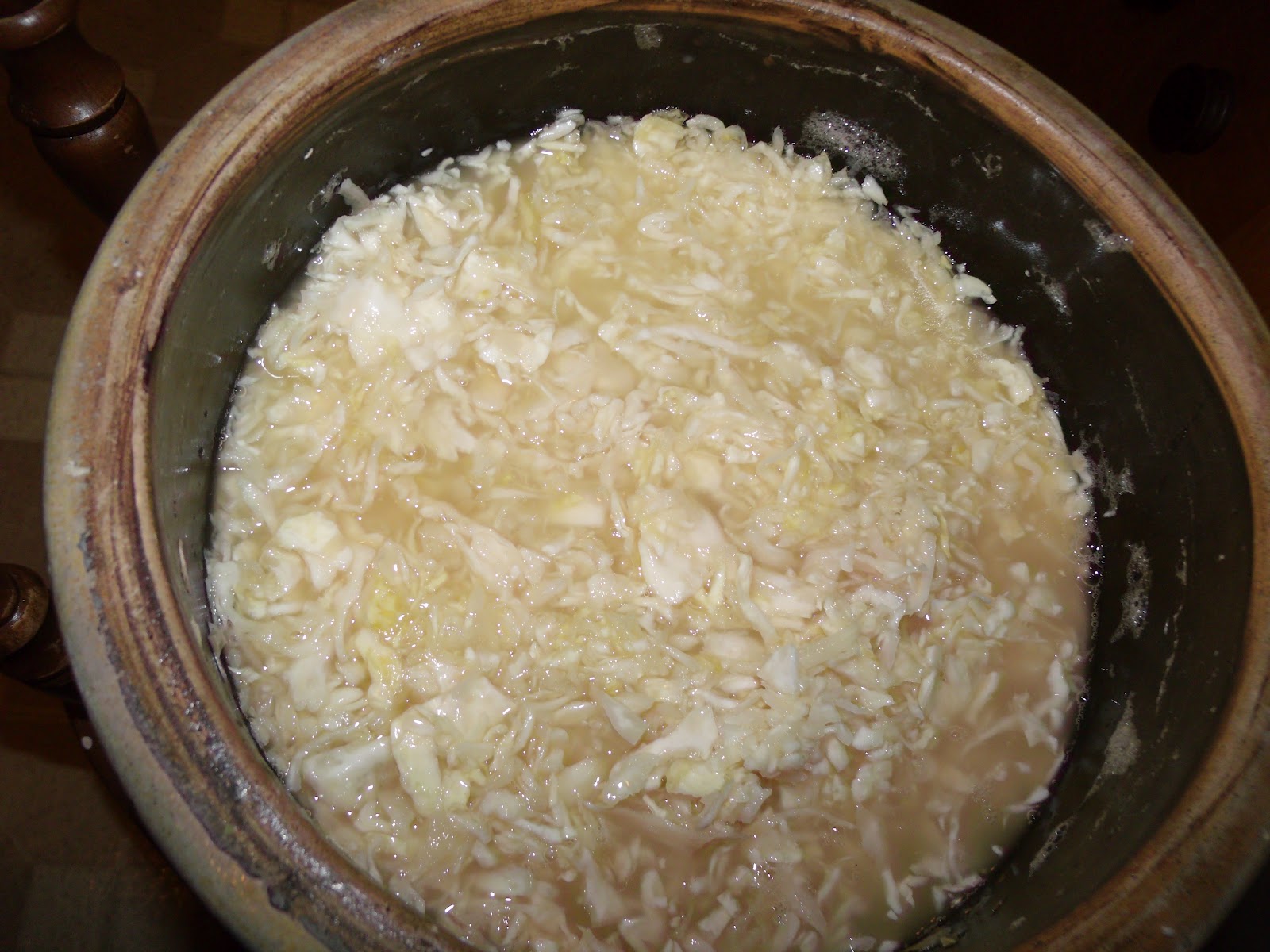 I followed the directions of working in 5# cabbage increments and using a scale and measuring cup I layered the cabbage into the crock and with VERY WELL WASHED HANDS mixed the salt into the cabbage ;-)) til I had a crock full and began pressing it down. As it sat, the 'brine' of cabbage/salt juices rose to the top of the mixture. Using a food grade plastic bucket lid cut to fit the inside of the crock, I placed it over the cabbage mixture allowing the brine to come out over the edges where it began to bubble.